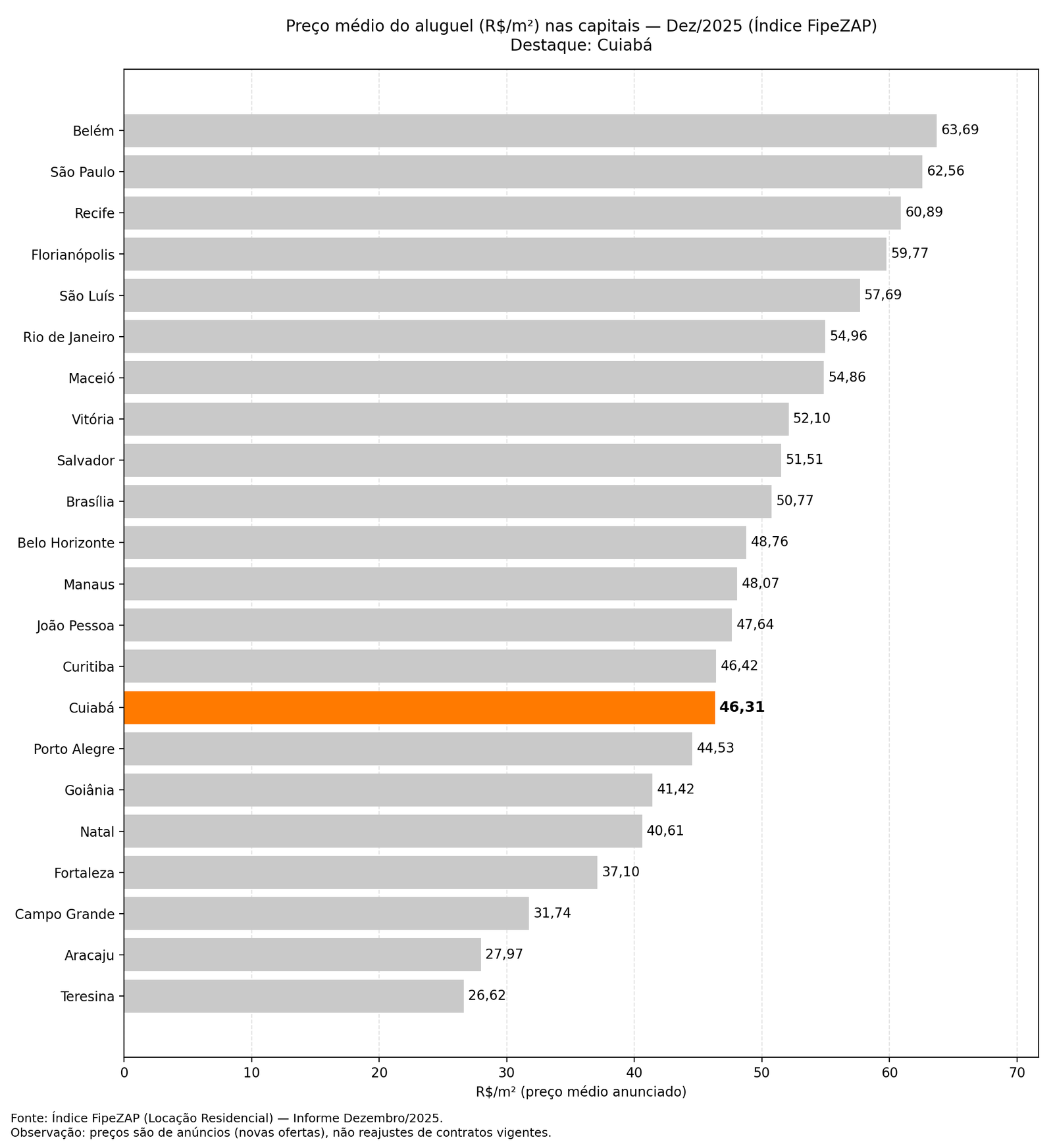 | Preço médio (R$/m²) - dez/2025 | R$ 46,31 | R$ 50,98 | Cuiabá ~9,16% abaixo da média nacional (em preço) |