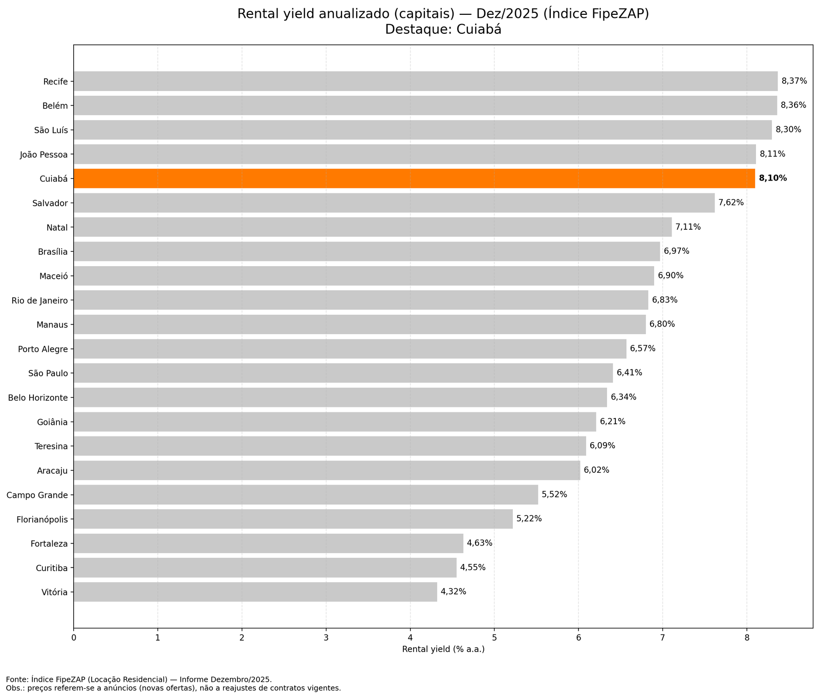 | Rental yield anualizado | 8,10% a.a. | 5,96% a.a. | Cuiabá está entre as maiores rentabilidades |