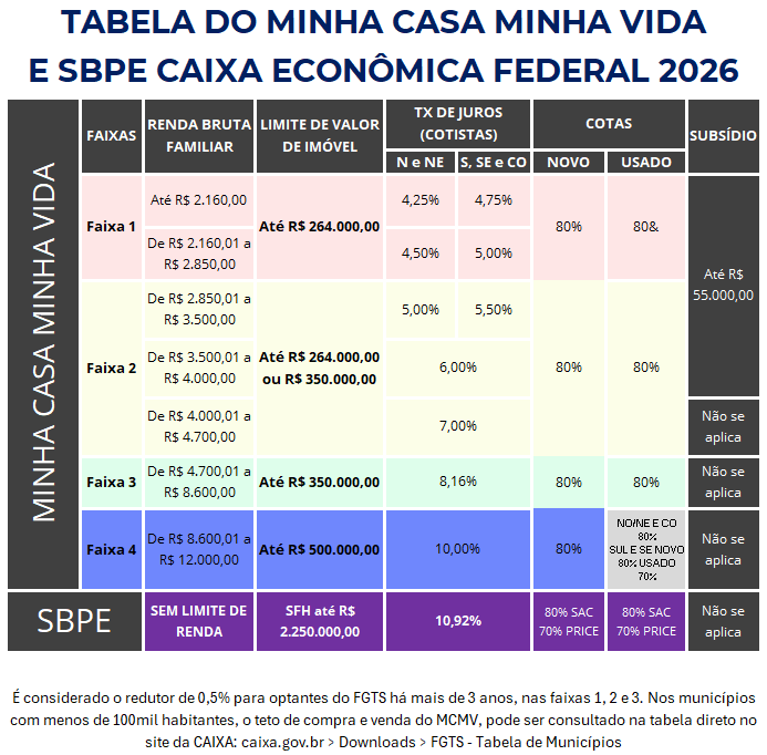 Tabela 2026 do Minha Casa Minha Vida e SBPE (CAIXA): como ler, onde você se encaixa e o que pode dar errado